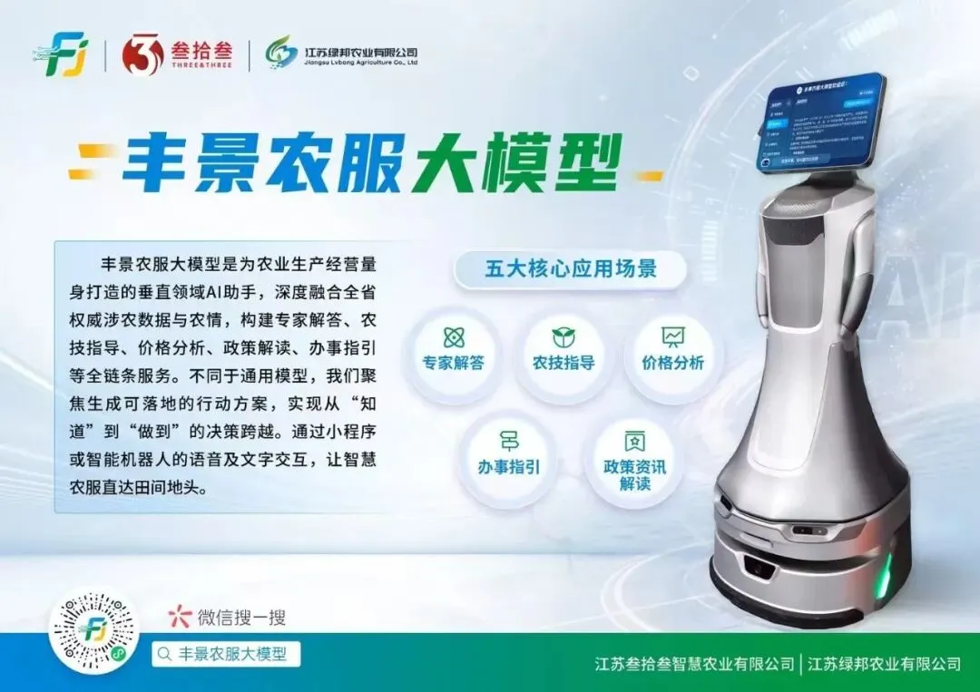 作为国家级专精特新“小巨人”企业,江苏叁拾叁深耕智慧农业近十年,构建了“感知-认知-决策-执行”全链条技术体系,其丰景农服大模型是为农业生产经营量身打造的垂直领域AI助手,深度融合全省权威涉农数据与农情,构建专家解答、农技指导、价格分析、政策解读、办事指引等全链条服务,聚焦生成可落地的行动方案,通过小程序或智能机器人的语音及文字交互,让智慧农服直达田间地头。