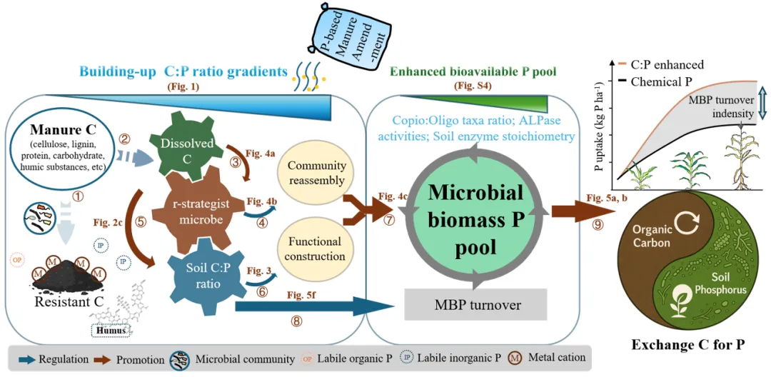 图1 本研究提出了“以碳换磷”的磷管理策略,即粪肥施用通过向土壤中输入微生物可利用的有机碳,激活土著微生物群落,进而触发微生物介导的土壤磷素活化与周转过程,并将固定态的肥料来源磷转化为生物有效形态以满足作物需求。