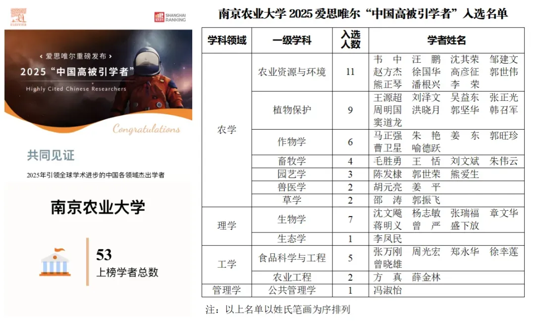 近日,爱思唯尔(Elsevier)发布2025“中国高被引学者”榜单。南京农业大学共有53位学者入选,入选人数位列全国第29,农业高校第2,全省第3,分布在农学、理学、工学、管理学四个学科领域。其中,沈其荣、赵方杰、杨志敏、沈文飚、徐国华、郑永华等6位教授连续12年入选,彰显了南京农业大学推动教育、科技、人才一体化发展的显著成效。