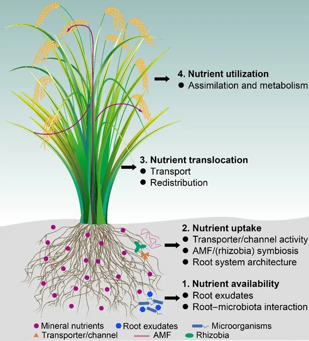氮磷利用效率主要由以下四组相互关联的性状共同决定:营养有效性(受根系分泌物及根系–微生物互作调控)、营养吸收(涉及转运蛋白活性、菌根/根瘤菌共生与根系构型)、营养转运(与养分运输及再分配相关)和营养利用(取决于养分的同化与代谢过程)。
