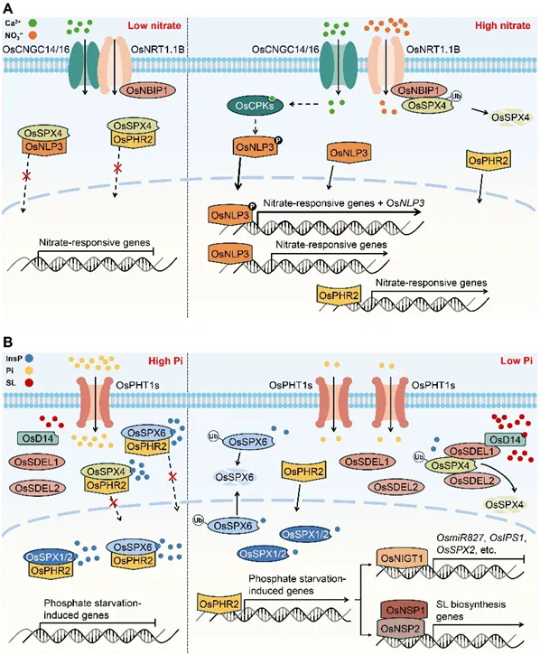 基于水稻在氮磷营养研究中的系统积累,阐述了水稻氮磷信号通路的调控机制。硝酸盐信号通过其受体NRT1.1B介导两个并行模块:其一,硝酸盐促进NRT1.1B与SPX4互作,通过招募NBIP1降解SPX4,从而释放NLP3入核激活硝酸盐响应;其二,硝酸盐削弱NRT1.1B与CNGC14/16的互作,激活钙信号,诱导NLP3磷酸化,进而促进其核转位与转录活性。其中,钙信号模块实现分钟级快速感知与长期氮稳态维持,SPX4降解模块则强化小时级响应,二者时序互补协调短期同化与长期需求。