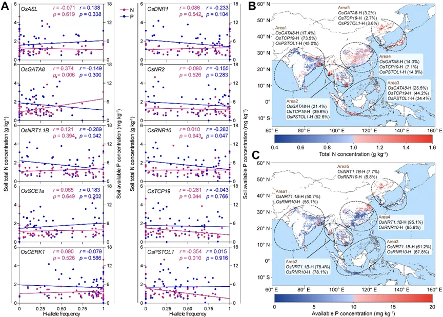 文章以水稻为模型,分析了氮/磷高效基因的自然变异与土壤氮/磷有效性的关联。发现TCP19与PSTOL1的优异等位基因频率和土壤总氮含量呈显著负相关,GATA8则呈显著正相关;NRT1.1B与RNR10的优异等位基因频率和土壤有效磷含量显著负相关。磷高效基因PSTOL1与氮高效基因NRT1.1B/RNR10分别介导水稻对低氮和低磷土壤的适应,揭示了作物适应本土环境过程中的氮磷协同机制。TCP19/PSTOL1与NRT1.1B/RNR10的优异等位基因分别在氮、磷充足地区发生丢失。因此,作物育种需在营养充足与限制条件下系统评价品种,以重新引入这些丢失的优异等位基因。