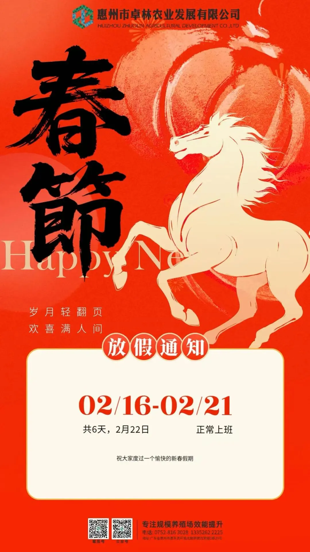 回首过去一年,感谢您选择卓林农业,信任我们的产品与服务。每一次的技术咨询,每一笔的订单托付,都是我们前行的最大动力。为了让全体员工能与家人共度团圆佳节,也为了新的一年能以更饱满的热情为您服务,卓林农业春节放假安排如下: