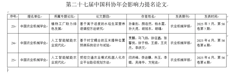 依托中国科协年会,与中国农业机械学会联合承办“人工智能赋能农业现代化”和“植物工厂助力绿色发展”2个专题论坛,3篇论文入选第二十七届中国科协年会影响力提名论文。