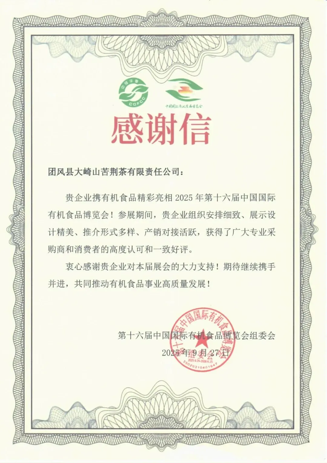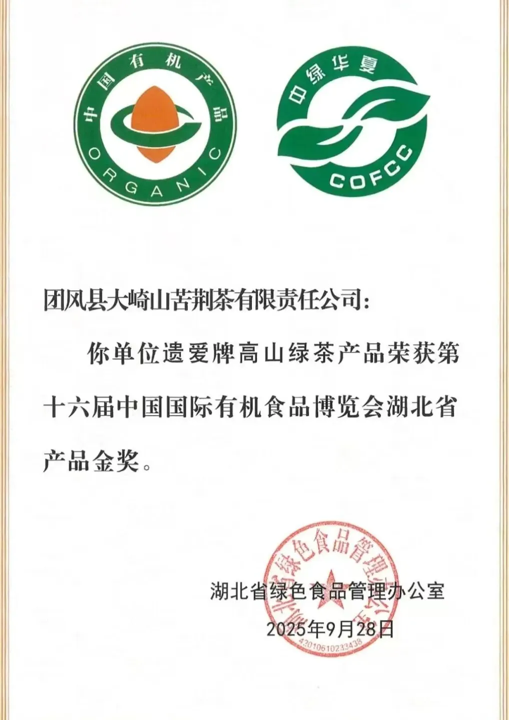 大崎山苦荆茶有限责任公司旗下遗爱牌高山绿茶产品荣获第十六届中国国际有机食品博览会湖北省产品金奖。