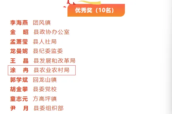 1人入选全国“农牧渔业丰收奖”推荐名单,4名年轻干部分别在2025“湖北工匠杯”技能大赛水生物病害防治员职业技能大赛、全县“弘扬大别山精神扬优强能建支点”演讲决赛、中青年干部公文写作大赛等省、县级赛事中获奖。