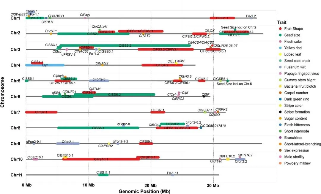 Fig. 1 Integrated maps containing functional genes and stable QTLs related to various traits for watermelon