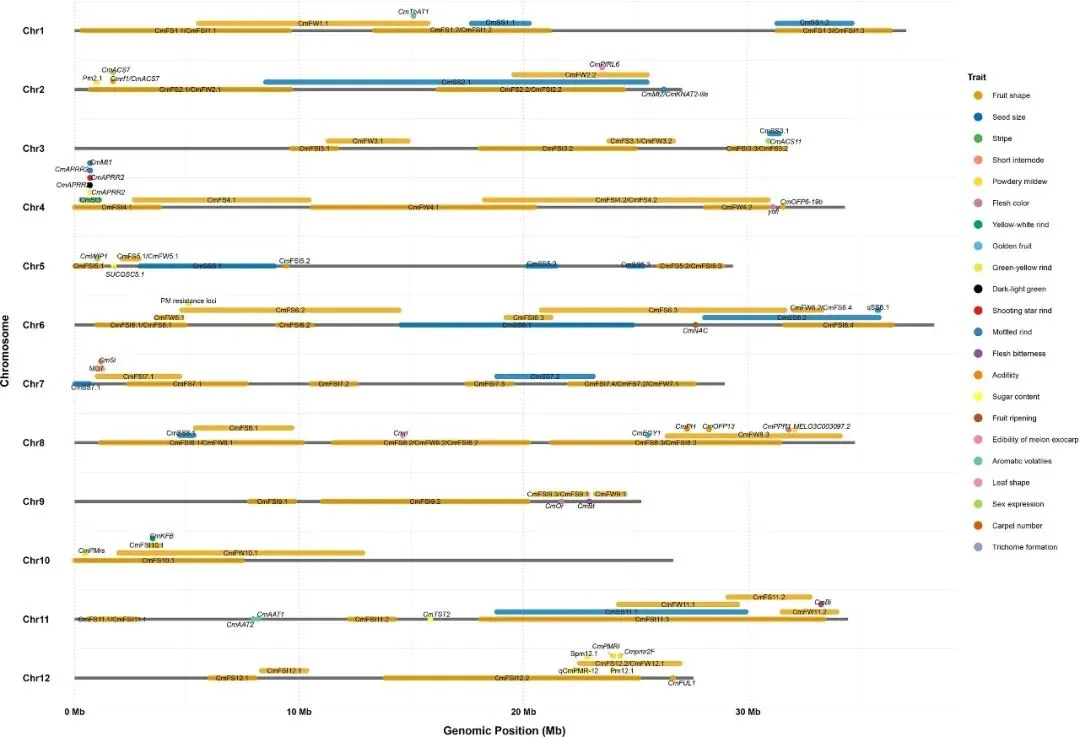 (1)在育种和种质资源改良过程中,西瓜、甜瓜的瓤色、含糖量、果实形状、植株形态、性别分化、种子性状以及抗病性一直是育种家和消费者十分关注的性状。利用与目标基因紧密连锁的分子标记,可以有效加速育种进程。因此,鉴定与上述目标育种性状相关的染色体区域或候选基因至关重要。本文整合了目前已经精细定位并明确其功能或在不同研究中获得稳定定位区间的85个西瓜和113个甜瓜重要性状连锁基因(或位点),并依据物理位置,将上述基因(或位点)分别绘制在了西瓜和甜瓜基因组上。