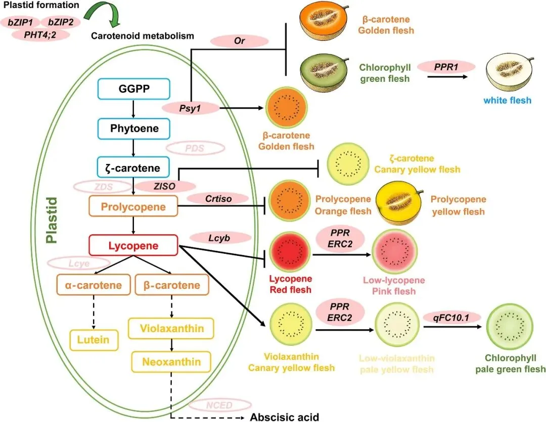 Fig. 3 Genes and trans factors for flesh color formation in watermelon and melon
