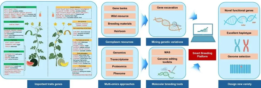 (3)在综述基础之上,本文进一步从野生种质资源利用、基因组从头驯化、高效基因编辑器开发、单倍体育种以及AI智能育种方面进行了阐述和展望,为今后西瓜、甜瓜高效、精准分子育种提出了基本框架。