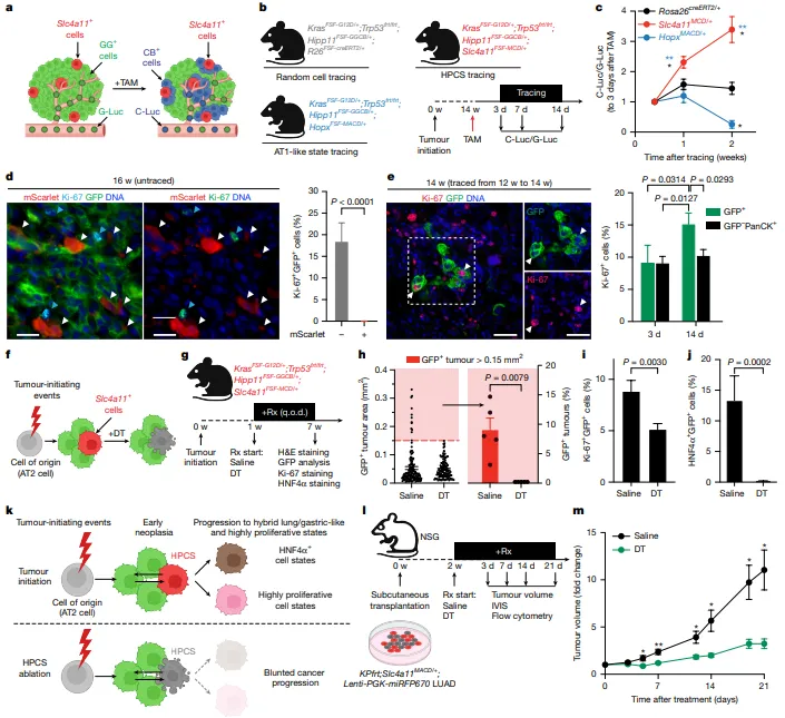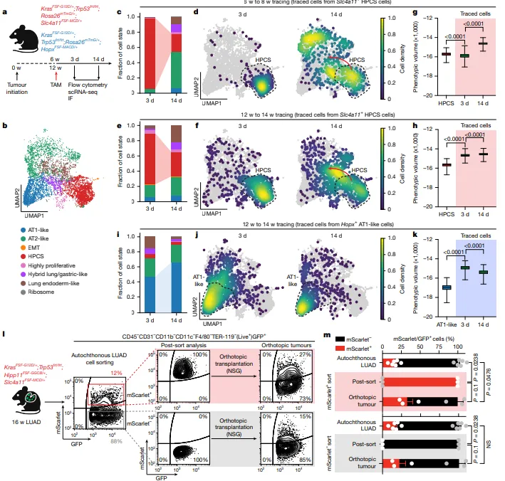 通过谱系追踪证实,HPCS具有强大的细胞状态转换能力,可分化为腺瘤和腺癌中所有观察到的癌细胞状态(图2c-f),且追踪14天后表型体积显著增加,是肿瘤异质性的核心驱动因素(图2g-h)。