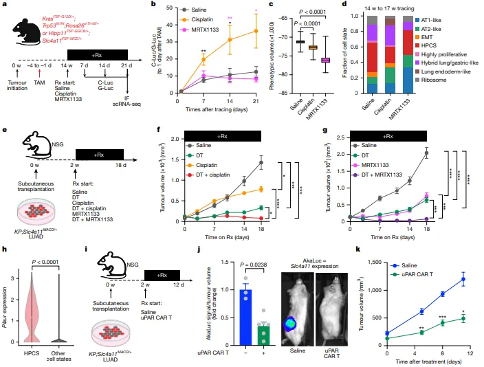 顺铂与MRTX1133主要清除non-HPCS,HPCS存活并富集于MRD;scRNA-seq证实HPCS可分化为多种耐药细胞状态。HPCS消融与化疗/靶向治疗联合可实现近完全肿瘤根除;此外,HPCS高表达Plaur,uPAR CAR-T可有效消融HPCS并显著抑瘤(图4)。