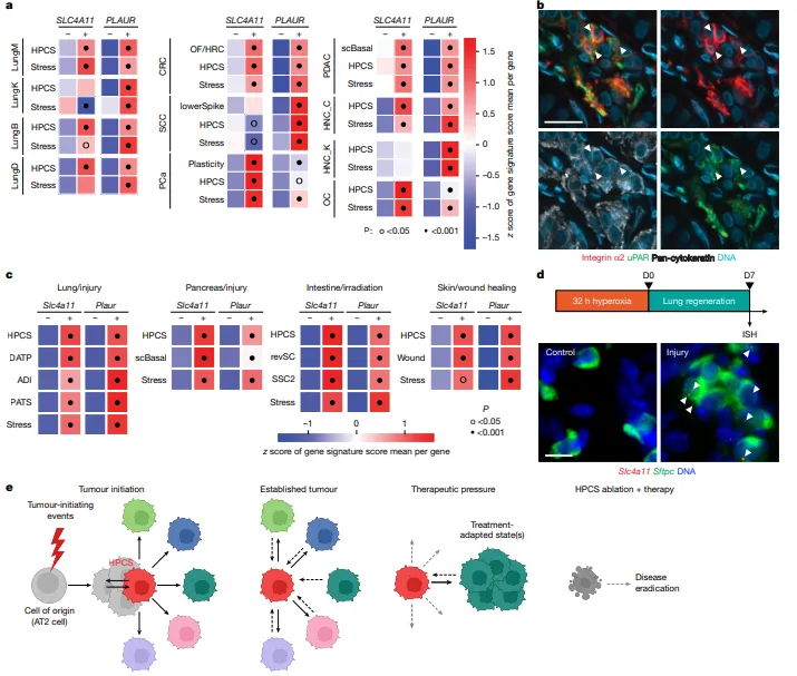 研究构建KP肺癌小鼠模型,通过Slc4a11位点敲入报告基因标记高可塑性细胞状态(HPCS);结合谱系追踪、分泌型荧光素酶纵向监测及细胞消融技术,探究HPCS功能;利用单细胞测序解析其细胞状态转换;通过化疗、靶向治疗结合消融实验验证治疗敏感性;借助uPAR CAR-T细胞靶向HPCS,同时跨癌种及再生上皮数据集验证HPCS保守性。