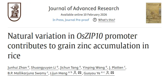 中国农业科学院深圳基因组所叶国友研究员团队在TOP期刊(IF=13)发表科研成果:OsZIP10基因启动子的自然变异调控水稻籽粒锌的积累