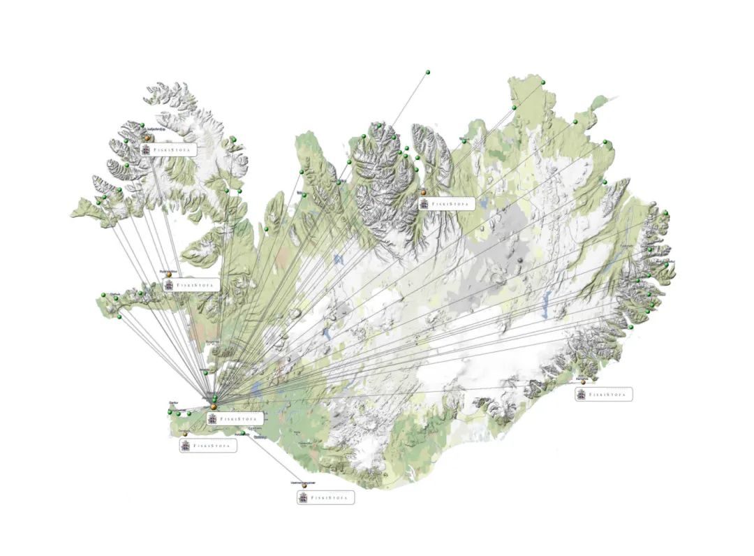 说起大西洋狼鱼的渔业管理,首先,在冰岛水域作业的所有渔船必须上报每次捕捞的渔获量日志记录。冰岛的渔获物仅限于在获得许可的上岸点进行装卸,并上报渔业管理局(本国执法机构)。所有上岸鱼类称重后将上岸信息存储在渔业管理局维护的专门数据库中,并可在互联网上实时查询(http://www.fiskistofa.is)。这些记录可供渔业管理工作人员检查,也可供海洋研究所的鱼类资源评估人员使用。下图为冰岛50多个上岸地点的分布情况,每年的上报数量超过六万次。