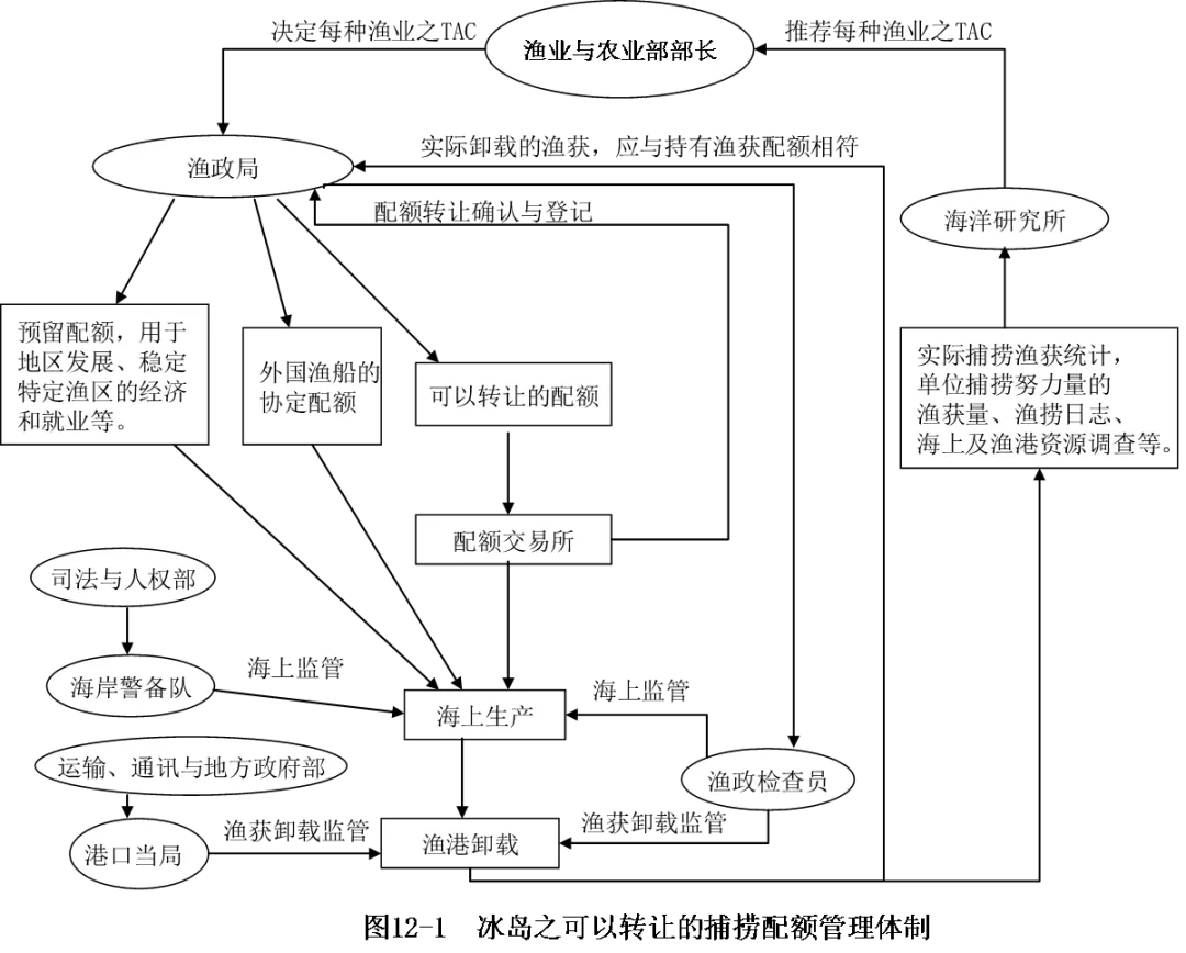 其次,也是最重要的,冰岛水域的渔业自1984年起在总可捕量(TAC)制度下进行管理,每艘渔船拥有TAC的一定百分比。捕捞年度从9月初开始,至次年8月底结束。该制度属于个体可转让配额(ITQ)制度,允许配额在渔船之间自由转让。