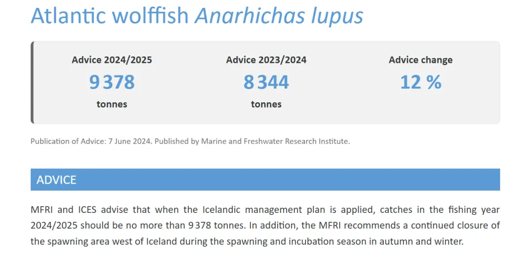 近年来,大西洋狼鱼的捕捞配额有所增加,如24到25年捕捞季的配额量上比一年增加了12%。2025年到2026 年的捕捞配额建议量则为9412 吨,比上一年略有增加。