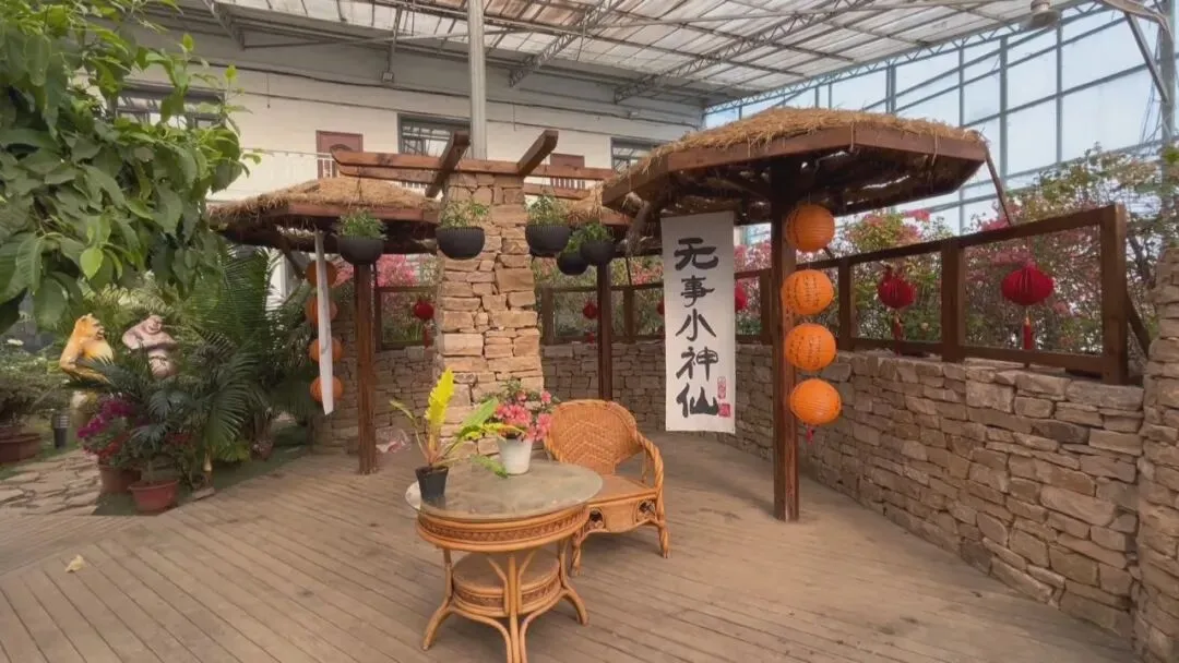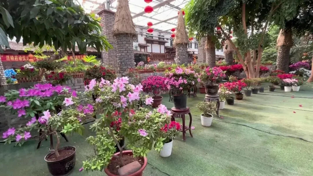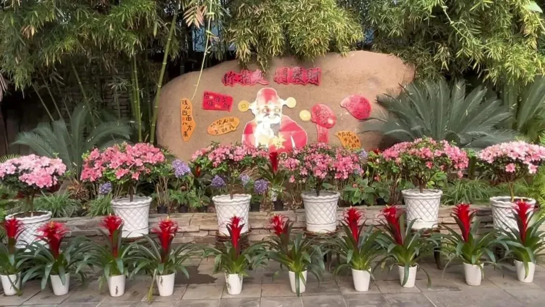 步入园区温室,宛如走进一座繁花秘境。玻璃穹顶之下,各类植物错落生长、长势喜人,蝴蝶兰、红掌、一品红等年宵花竞相绽放、色彩艳丽,在芭蕉树、棕榈等观赏树木的映衬下,尽显浓郁热带风情,与室外冬日寒意形成鲜明对比。