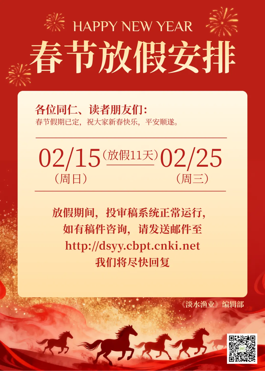 马扬蹄抒远志,银鱼摆尾报新春。值此 2026 丙午马年新春之际,《淡水渔业》编辑部向长期关心支持我们的各级领导、专家同仁与广大读者,致以最诚挚的祝福!