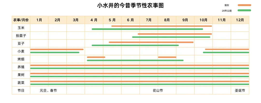 与其他村年轻人大量外出务工不同,小水井村有很多年轻人在村里谋生,有部分年轻人短期在外面打工。2020年以来,村委会党员干部带头开始土地流转,种植中、晚熟桃和蜂糖李、半边红李等经济林果,果林套种合适的白菜、土豆等时蔬,小水井人的收入确实提高了。现在大春季节主要种植苞谷、豆类(如大白豆、豇豆、四季豆等),由于冬春干旱,村民担心种植小春作物没有收益,因此小春季节大部分土地被撂荒,只有部分村民会种植小麦、燕麦、豌豆等作物。