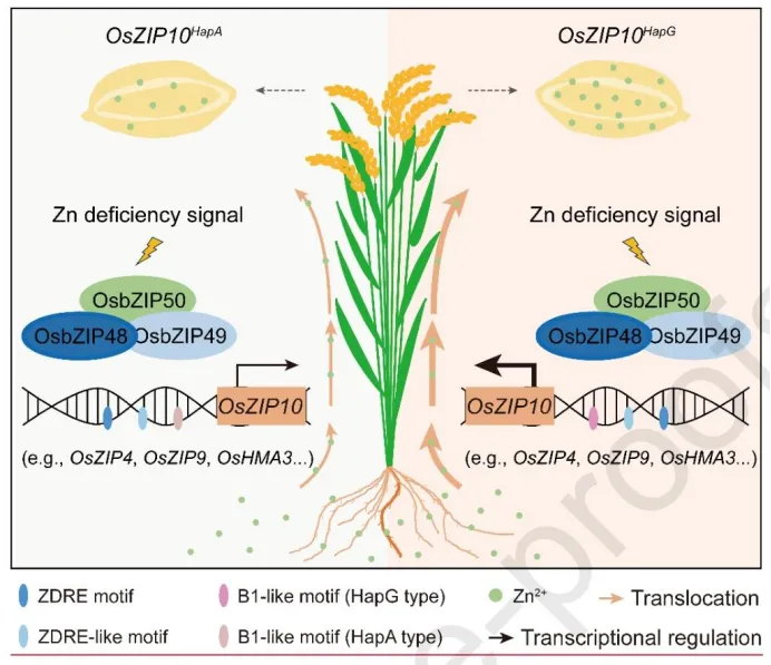 本研究明确了OsZIP10通过介导锌的根-冠转运和籽粒分配调控水稻缺锌耐受性和籽粒锌积累的核心功能,揭示了F-bZIPs通过B1-like和ZDRE/ZDRE-like基序调控OsZIP10表达的分子机制,且该调控模块在禾谷类作物中保守。OsZIP10启动子B1-like基序的自然变异是水稻籽粒锌含量差异的重要原因,HapG为优异单倍型。利用分子标记辅助选择导入HapG、基因组编辑改造启动子或采用胚乳特异性启动子驱动OsZIP10表达,是水稻锌生物强化的有效策略,为培育高锌水稻品种提供了基因资源和技术途径。