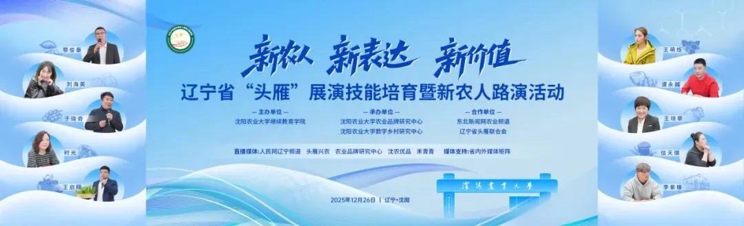 11月至12月,辽宁省头雁展演技能培育暨新农人路演活动在沈阳农业大学成功举办,围绕“新农人、新表达、新价值”主题,通过精准培育模式推动学员从生产能手向品牌主持人转型;