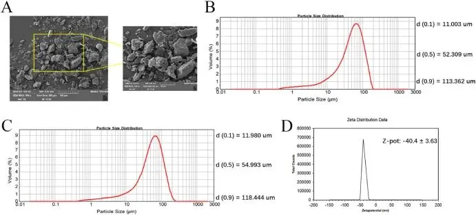 图1. PLA-MPs表征:(A)SEM图像(×500和×1000);(B)粉末粒径分布;(C)悬浮液粒径;(D)Zeta电位。