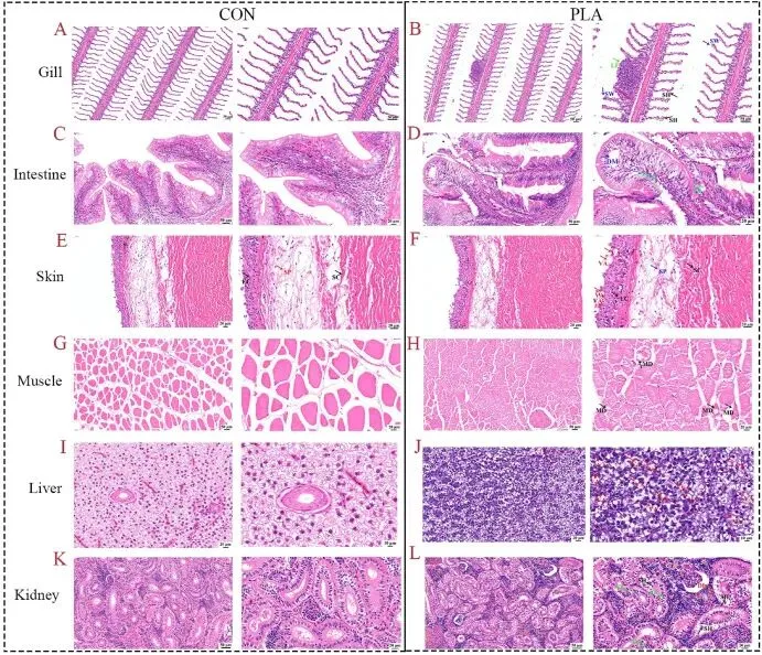 图3. 组织病理学染色结果(鳃、肠、皮肤、肌肉、肝、肾)显示结构损伤。