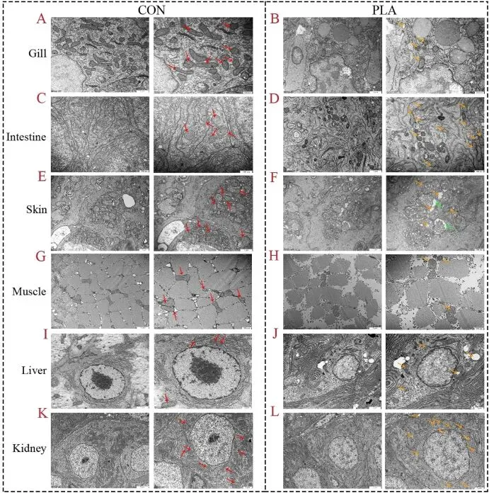 图4. 超微结构TEM图像(鳃、肠、皮肤、肌肉、肝、肾)显示线粒体损伤。