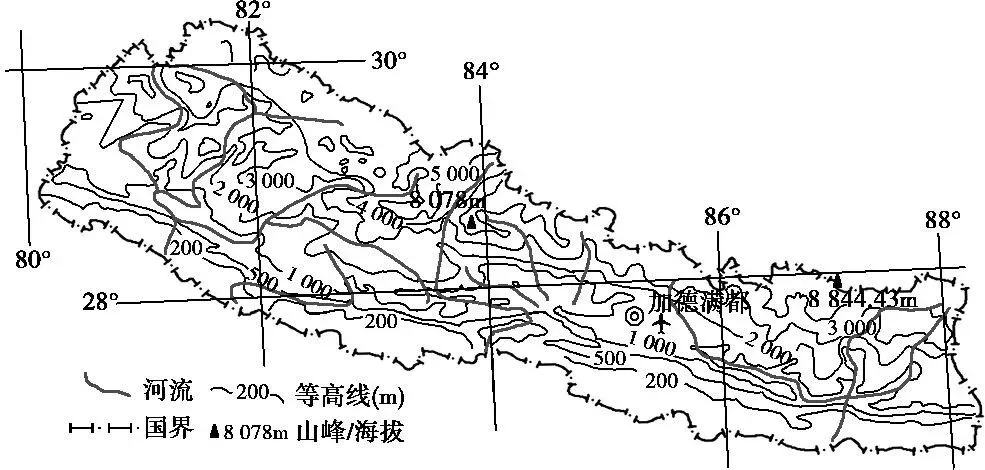 尼泊尔是世界上最不发达的国家之一,全国80%的人口从事农业生产,水稻是该国主要农作物,不利的自然条件使得这里的粮食自给能力十分有限。近年来,该国积极从中国引进农业科研成果,其中杂交水稻让尼泊尔农民尝到了甜头。下图为尼泊尔等高线地形图。据此完成下面两题。