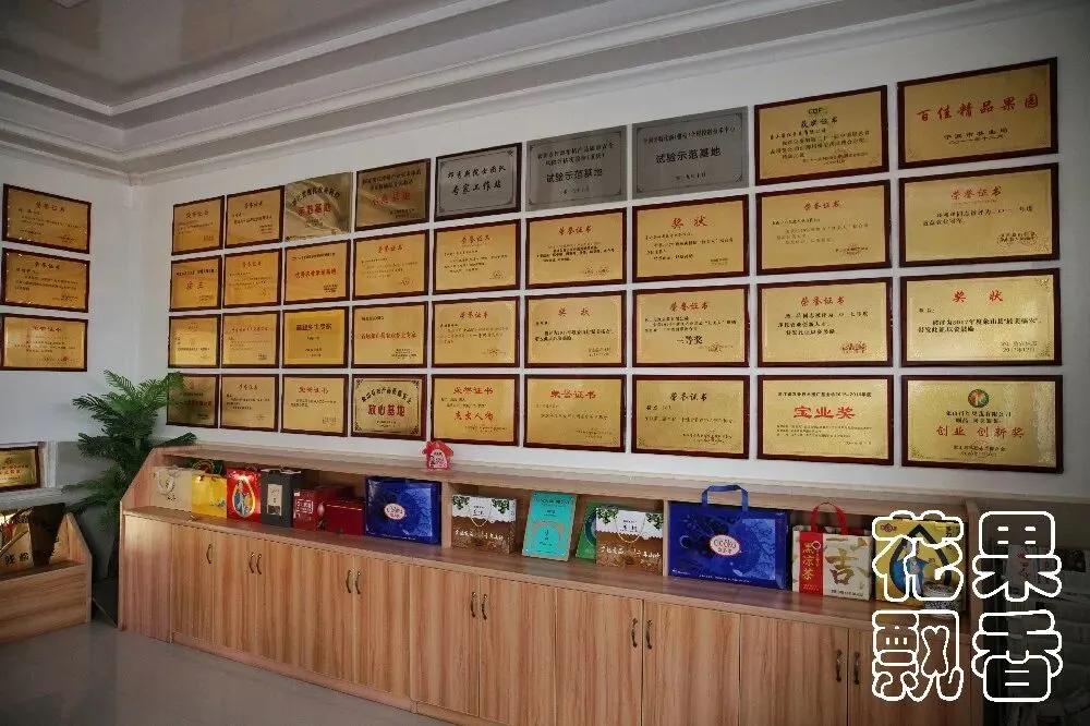 在顾品家最早的果园中,竖立着“中国第一棵‘红美人’”的标志。从2002年的嫁接时间算起,“红美人”在中国已经经历了20年的发展历程。从3亩到300余亩,从露地到设施,从家庭作坊到宽敞的包装车间,顾品也从一个青春焕发的小伙子变成一位大腹便便的中年男子。伴随体重和体量的增长,还有已经无处张贴的荣誉墙。