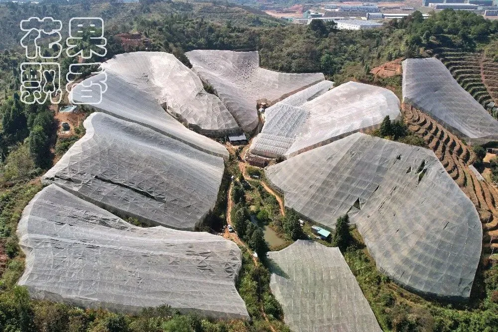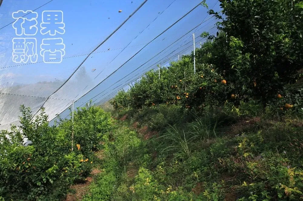 确实很密,密得根本看不出行间和株间,只有主路还勉强可以站人。曹利华扒了扒茂密的枝叶,接着介绍道:“密植的好处是回本快,2016年种,2018年开始结果,2019年就回本了;缺点是橙子的品质不稳定,内膛果的口感会偏淡一些。”“这种网棚的造价要多少?”我的注意力不在果子上,而是在头顶的网架上。它依山而建,下面是镀锌钢管的支架,上面是用星状网线托起的防虫网,像一只只八爪鱼支撑起整个网棚。“我这个网棚比较便宜,造价大概是4500元左右。”曹利华大学学的是服装专业,防虫网的拼接和网线的布置都是自己干的,“现在一亩地的造价在6000~10000元不等。”