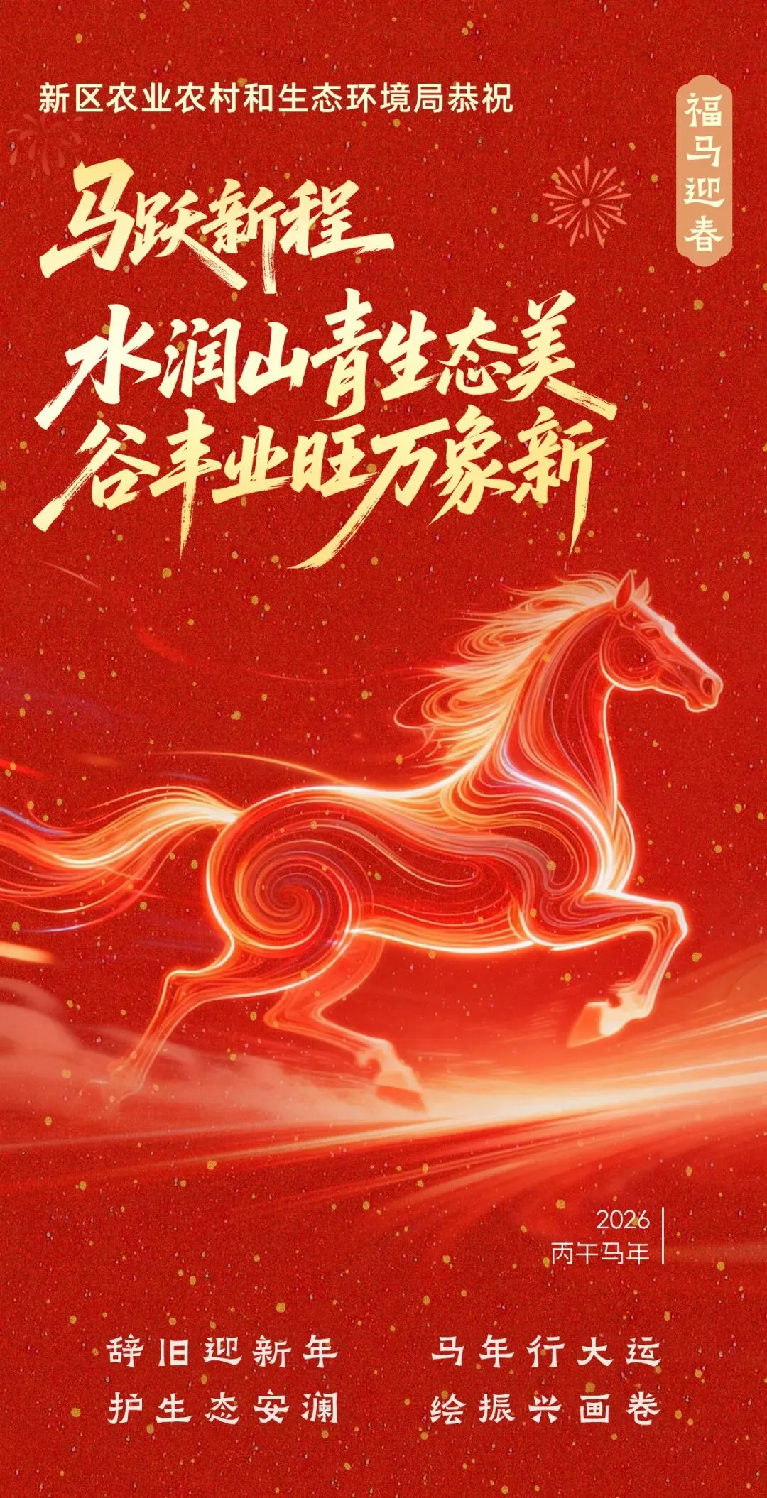 灵蛇摆尾辞旧岁,骏马扬蹄报新春。值此喜迎马年新春佳节之际,新区农业农村和生态环境局向所有支持、关心新区农业农村、水利、生态环境发展的各位领导、社会各界人士表示衷心的感谢!向一年来锐意进取的全体干部职工致以诚挚的问候!祝大家龙马精神、阖家幸福、马年大吉!