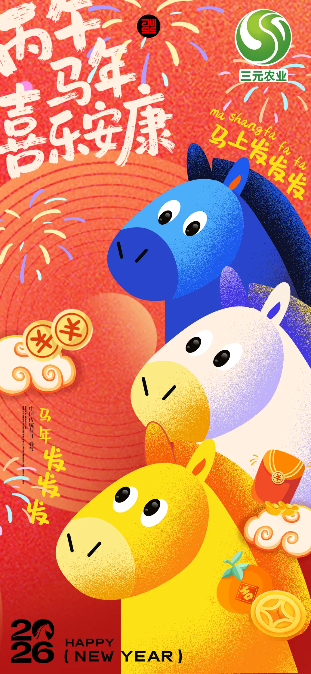 值此新春佳节,三元农业科技园全体同仁,向长期以来关心、支持我们发展的各级领导、合作伙伴及广大市民朋友,致以最诚挚的问候!愿智慧农业如骏马奔腾,跑出乡村振兴的加速度;愿您的生活如温室硕果,挂满健康与幸福。新的一年,我们一起 “鲜” 马夺人,收获满满!🍓🌾
