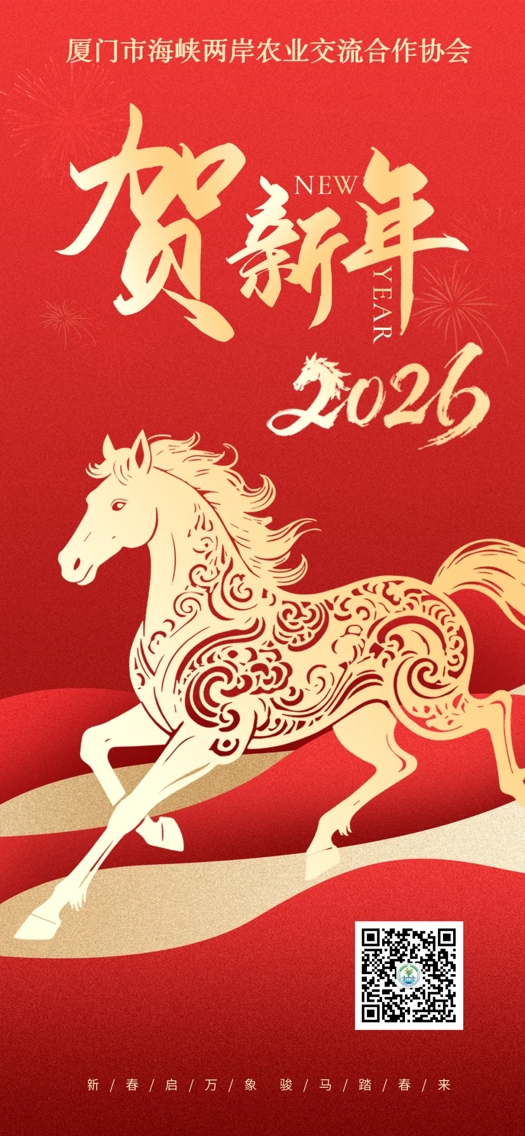 岁序更替,华章日新。值此 2026 丙午马年新春佳节来临之际,厦门市海峡两岸农业交流合作协会谨向全体会员、乡贤挚友及长期关心支持厦台农业交流的社会各界人士,致以最诚挚的问候和新春的祝福!