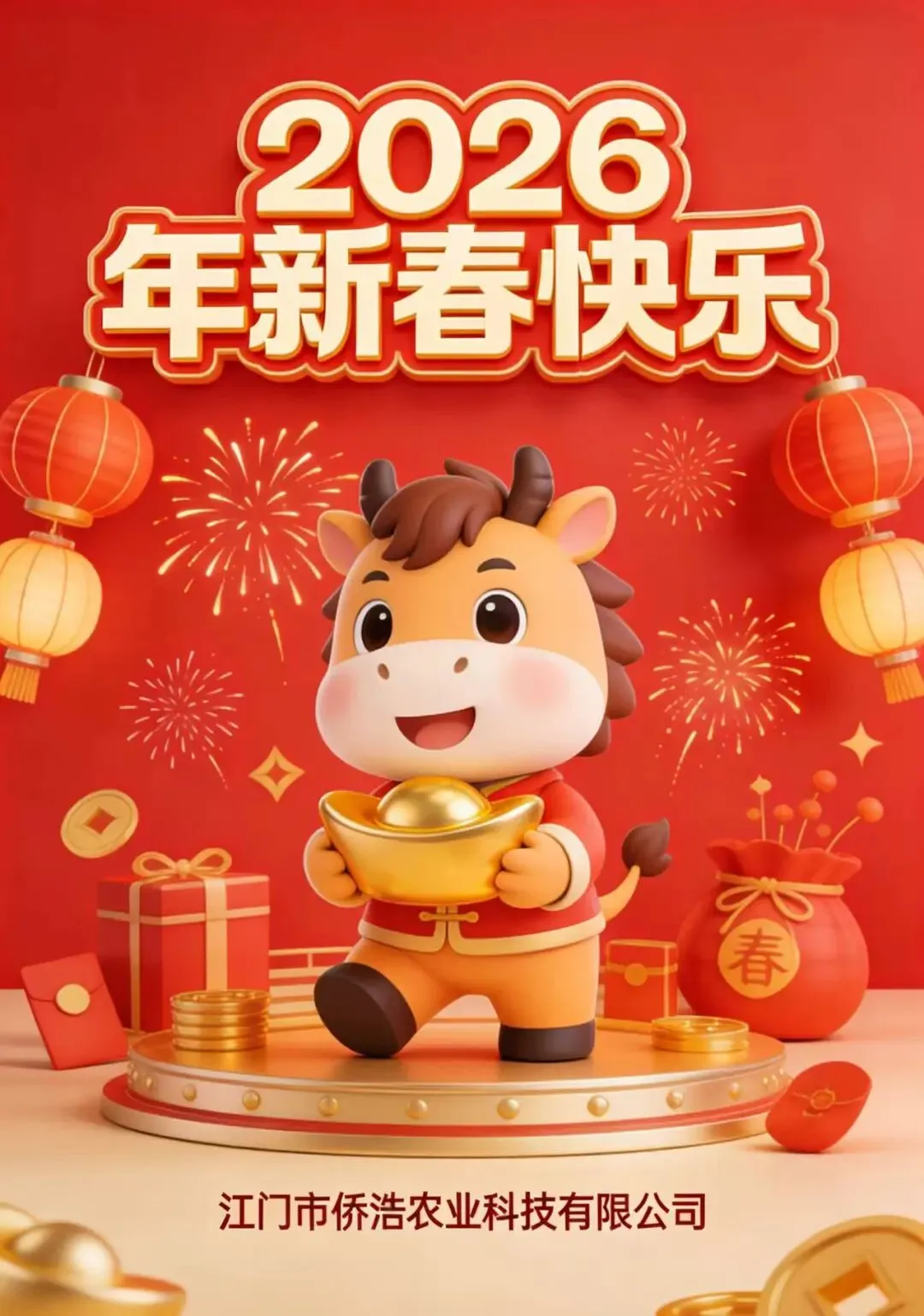 春节的钟声即将敲响,金马迎新春,开启新征程,值此新年到来之际,江门市侨浩农业科技有限公司给大家拜年啦!祝大家马年大吉,新年快乐!