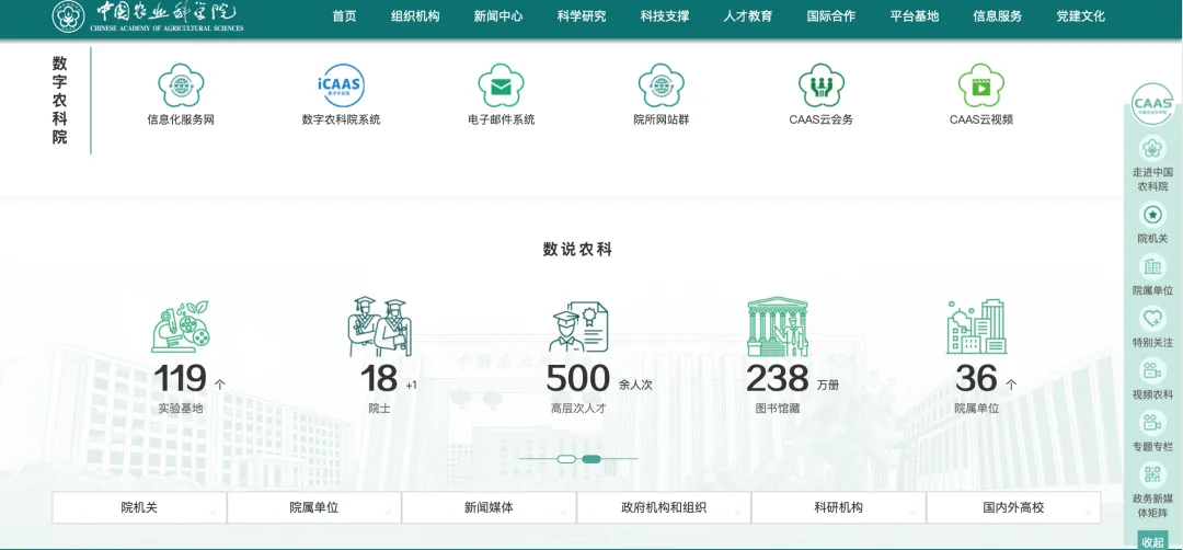 中国农业科学院(CAAS,简称“农科院”)是直属于农业农村部的国家顶级农业科研“国家队”,成立于1957年,是全国综合性农业科学研究的最高学术机构,建有全球最大的大动物生物安全四级实验室单体设施、亚洲最大的大动物生物安全三级实验室集群;建有2个国家重大科技基础设施、15个全国重点实验室、1个国家技术创新中心、5个国家工程技术研究中心、7个国家工程实验室和工程研究中心。建有12个国家农作物种质资源库、13个国家农作物种质资源圃,长期保存作物品种资源超过53万份,居世界第二位;2021年新建成世界上单体最大、原生资源最多的国家作物种质库。国家农业图书馆的农业专业书刊馆藏位居亚洲第一、世界第三。