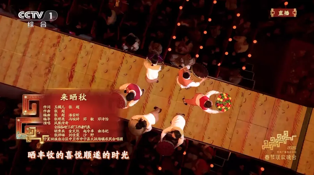 除了上述报幕人外,还有一个农业节目登上春晚,歌曲《来晒秋》:沉浸式展现丰收喜悦由凤凰传奇、宁夏回族自治区中卫市中宁县大战场镇农民合唱团及全国各地 “三农” 工作者代表共同演绎。