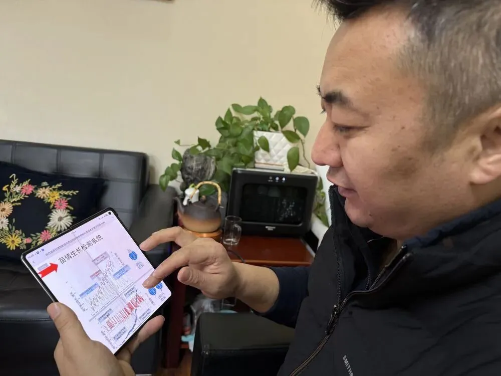 许荣辉向记者展示最新的田间管理技术方案。新华社记者 张斌 摄