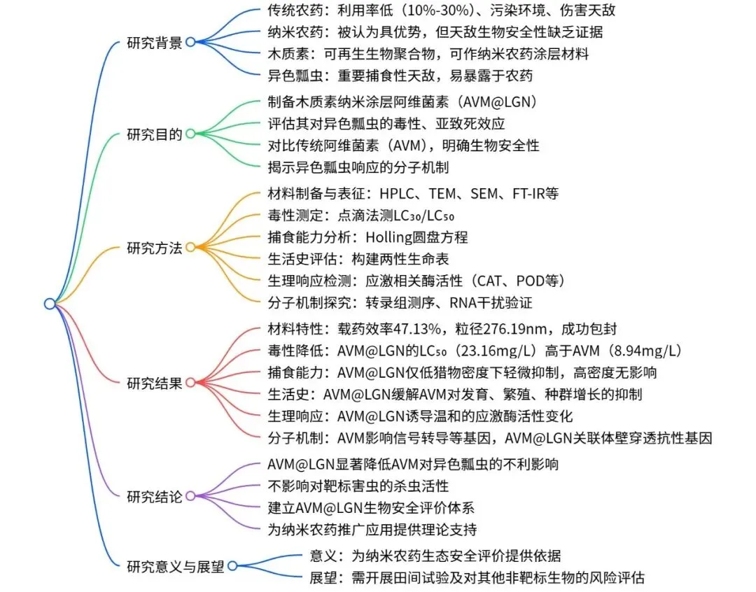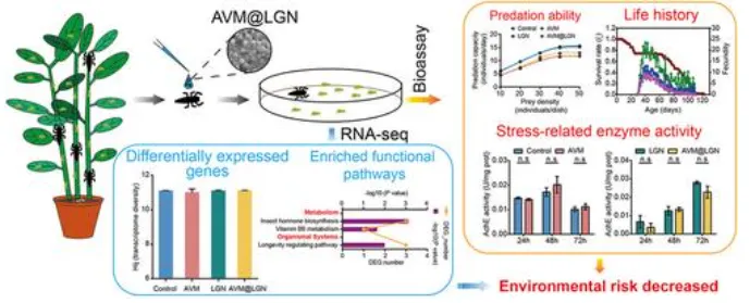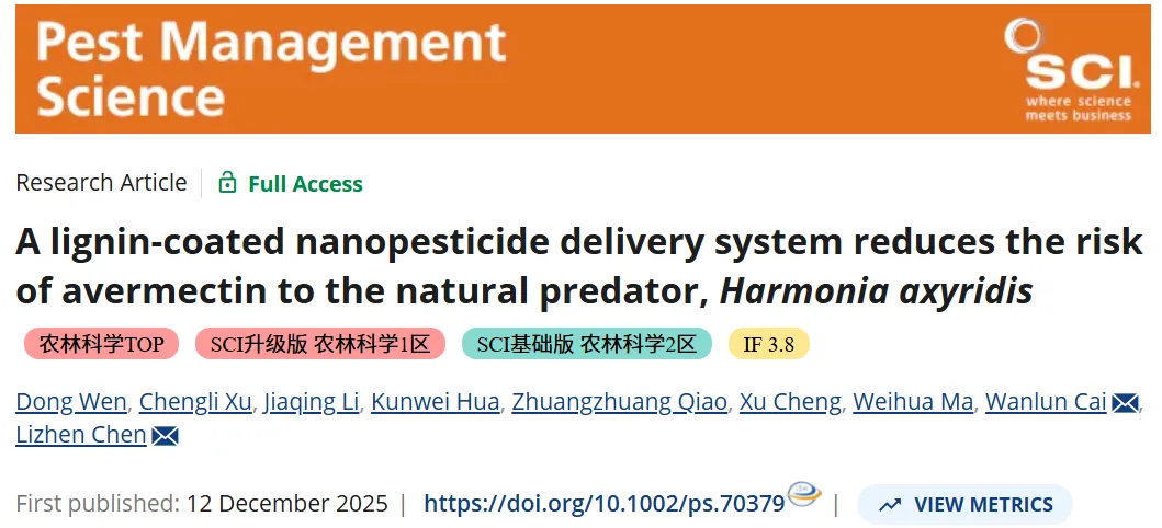 近日,华中农业大学陈利珍老师与蔡万伦老师团队合作在《Pest Management Science》发表名为"A lignin-coated nanopesticide delivery system reduces the risk of avermectin to the natural predator, Harmonia axyridis" 的期刊论文。该团队聚焦木质素纳米涂层修饰的阿维菌素纳米农药传递系统(AVM@LGN),系统评估了其对天敌昆虫异色瓢虫(Harmonia axyridis)的生物安全性,同时验证了其对靶标害虫豌豆蚜的杀虫活性,为纳米农药的生态安全评价和农业应用提供了关键的理论与实验依据,核心结论是AVM@LGN 显著降低了阿维菌素对异色瓢虫的毒性和不利影响,且不影响对靶标害虫的防效。