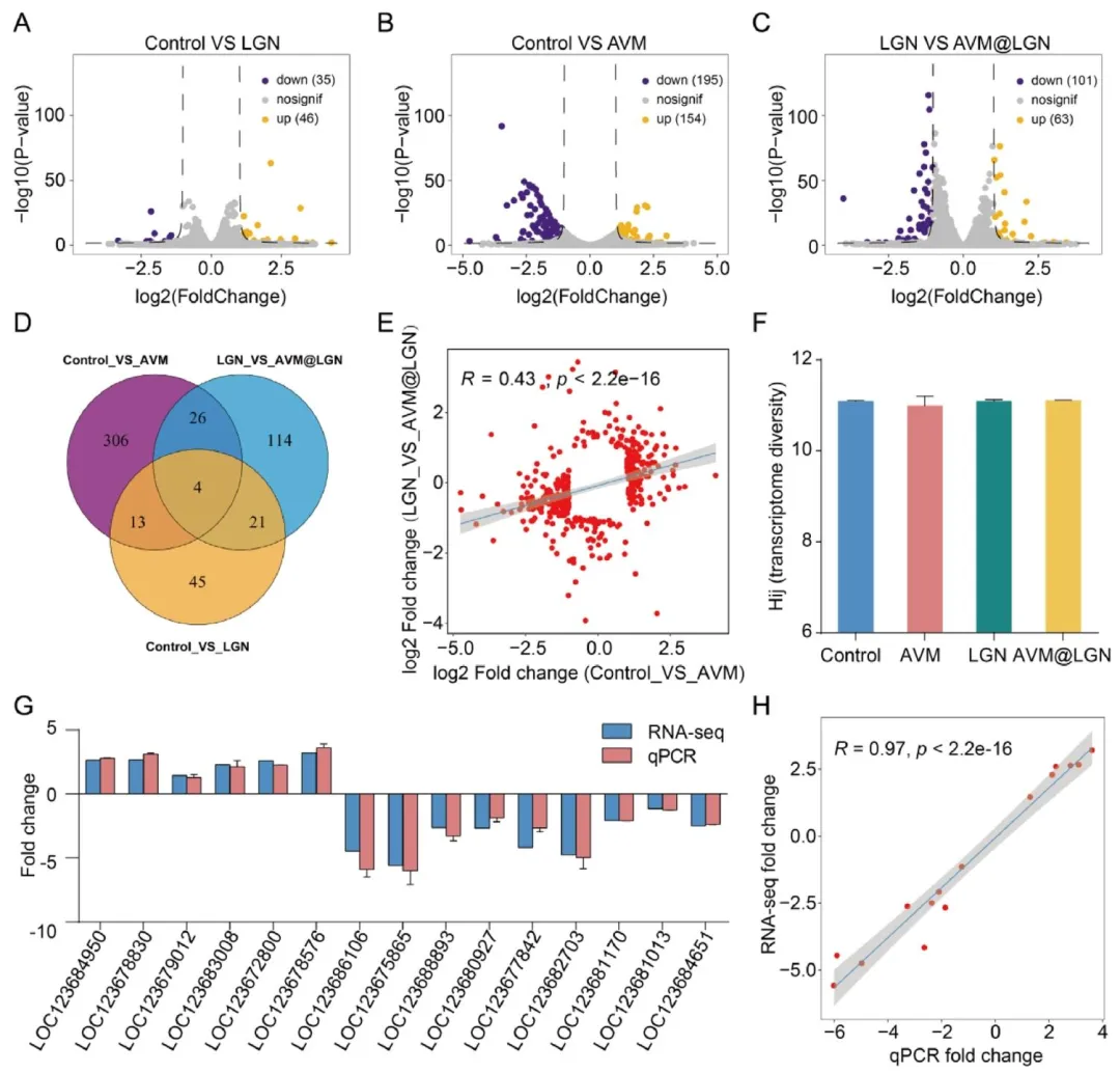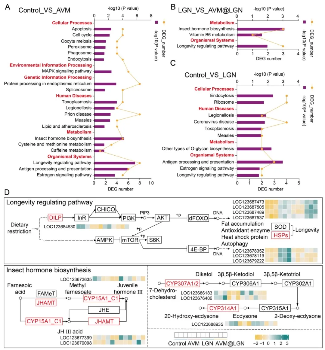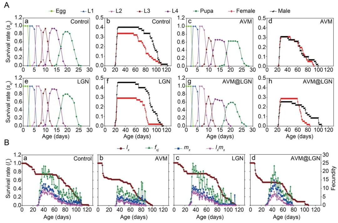 木质素(LGN)作为一种储量丰富的可再生生物聚合物,具有两亲性、抗菌活性和抗氧化能力等显著特性。凭借其反应性苯丙烷单元、共轭结构和亲水性官能团,木质素已被用作可交联涂层材料和控释农用化学品制剂的基质。随着纳米材料加工技术的最新进展,木质素也已被制备成纳米颗粒,成为农用化学品纳米制剂中用途广泛的基质。该策略显著提升了农药的亲水性、光稳定性和耐久性。然而,尽管具备这些优势,木质素涂层纳米农药对非靶标生物的潜在生态毒理风险仍未得到充分探究。异色瓢虫(Harmonia axyridis(Pallas),鞘翅目:瓢虫科)是一种重要的捕食性天敌生物,可捕食蚜虫、蓟马和鳞翅目幼虫等。由于其出色的生物防治潜力,异色瓢虫在农业生态系统中频繁暴露于化学农药环境中。已有研究表明,传统农药会显著降低其存活率、发育速率和捕食效率。但纳米农药能否减轻这些不利影响,或是否会对异色瓢虫带来新的生态毒理风险,仍有待评估。该研究采用木质素纳米材料对 γ- 氨基丁酸和谷氨酸门控氯离子通道激动剂 —— 阿维菌素(AVM)进行涂层修饰,制备出纳米级缓释制剂(AVM@LGN)。我们评估了该制剂对异色瓢虫的毒性和亚致死效应,并阐明了异色瓢虫暴露于该制剂后的生理和代谢响应。同时,我们还在传统阿维菌素处理条件下测定了相同指标,以对比评估 AVM@LGN 的生物安全性。此外,通过转录组测序揭示了异色瓢虫响应不同阿维菌素制剂的基因表达模式及潜在分子机制。总体而言,本研究全面评估了 AVM@LGN 缓释制剂对异色瓢虫的生物安全性,为纳米农药风险评估及其在农业中的可持续应用提供了宝贵见解。图1通过透射电子显微镜(TEM)、粒径分布分析及傅里叶变换红外光谱(FT-IR)对木质素纳米材料(LGN)和木质素涂层阿维菌素纳米农药(AVM@LGN)进行了表征,结果显示:AVM@LGN 的形貌与 LGN 相似,但平均粒径(276.19 nm)大于 LGN(170.65 nm);FT-IR 光谱中,AVM@LGN 在 3465.00 cm⁻¹ 处出现阿维菌素(AVM)特有的–OH 伸缩振动吸收峰,在 1459.00 cm⁻¹ 和 1735.00 cm⁻¹ 处分别出现芳香族 C=C 伸缩和脂肪族 C=O 伸缩的特征峰,结合高效液相色谱(HPLC)测得的 47.13% 载药效率,共同证实 AVM 已成功被木质素纳米材料包封,为后续评估其生物安全性和作用效果奠定了物质基础。图2通过捕食能力测定实验与体重检测,探究了阿维菌素(AVM)和木质素涂层阿维菌素(AVM@LGN)对异色瓢虫的影响,结果显示:经 LC₃₀浓度处理后,异色瓢虫的捕食功能符合 HollingⅡ 型响应模型,AVM 处理组在所有蚜虫密度下捕食量均显著低于对照组和木质素(LGN)组,而 AVM@LGN 组仅在低猎物密度(10、20 头 / 皿)时捕食量受抑制,高密度下抑制效应缓解,且其瞬时攻击率、猎物处理时间及捕食能力(a/Th)均优于 AVM 组,搜寻效率也更高;同时,AVM 组雌性成虫体重和雌雄蛹重显著低于对照组,而 AVM@LGN 组的成虫体重、蛹重与对照组无显著差异,表明 AVM@LGN 在保障对靶标害虫杀虫活性的同时,显著缓解了 AVM 对异色瓢虫捕食能力和体重的抑制作用。图3通过年龄 - 龄期特异性存活率和种群存活繁殖相关曲线,展示了阿维菌素(AVM)和木质素涂层阿维菌素(AVM@LGN)对异色瓢虫生活史的影响,结果显示:与对照组(Control)和纯木质素组(LGN)相比,AVM 和 AVM@LGN 处理均显著降低了异色瓢虫 3 龄、4 龄幼虫、蛹期及雄性成虫的龄期特异性存活率,且在处理初期 10 天内种群存活率急剧下降,存活曲线后续虽趋于平稳但仍低于对照组和 LGN 组;繁殖方面,AVM 处理显著延迟了产卵高峰、缩短了产卵期并抑制日产卵量,而 AVM@LGN 组的繁殖抑制效应明显缓解,其年龄 - 龄期特异性繁殖力(fₓⱼ)、年龄特异性繁殖力(mₓ)及年龄特异性母性(lₓmₓ)的峰值均高于 AVM 组,且接近对照组水平;同时,AVM 组异色瓢虫的生命期望和繁殖价值显著低于对照组,而 AVM@LGN 组有所回升,表明 AVM@LGN 有效减轻了 AVM 对异色瓢虫存活、繁殖及种群延续的不利影响。图4通过检测 24h、48h、72h 三个时间点异色瓢虫体内乙酰胆碱酯酶(AchE)、过氧化氢酶(CAT)、过氧化物酶(POD)和谷胱甘肽 S - 转移酶(GST)四种应激相关酶的活性,探究了阿维菌素(AVM)和木质素涂层阿维菌素(AVM@LGN)对其生理代谢的影响,结果显示:AchE 活性在各处理组间及不同时间点均无显著差异;AVM 组在 24h 和 48h 显著诱导 CAT、GST 活性,而 AVM@LGN 组仅在 48h 对 CAT、GST 活性有显著诱导作用,且诱导强度更温和;POD 活性在 AVM 组无显著变化,仅 AVM@LGN 组在 48h 较木质素(LGN)组显著升高;整体来看,AVM@LGN 相较于 AVM,显著延迟并减轻了对异色瓢虫的生理应激反应,进一步证实其对天敌昆虫的安全性更优。图5通过转录组测序分析探究了异色瓢虫在不同处理下的基因表达差异,结果显示:对照组(Control)与纯木质素组(LGN)间差异表达基因(DEGs)数量较少(46 个上调、35 个下调),对照组与纯阿维菌素组(AVM)间有 154 个上调、195 个下调 DEGs,而 LGN 组与木质素涂层阿维菌素组(AVM@LGN)间有 63 个上调、101 个下调 DEGs,三组对比共存在 30 个共同 DEGs,且 Control vs AVM 组的特有 DEGs(306 个)远多于 LGN vs AVM@LGN 组(114 个);两组核心对比的 DEGs 表达模式呈中等程度相关(R=0.43),四组处理的转录组多样性无显著差异;GO 富集分析表明,Control vs AVM 组的 DEGs 富集于胞外区域、铁离子结合等功能,LGN vs AVM@LGN 组的 DEGs 则与几丁质基表皮结构及发育相关;随机选取 15 个 DEGs 进行 qPCR 验证,其表达倍数变化与 RNA-seq 结果高