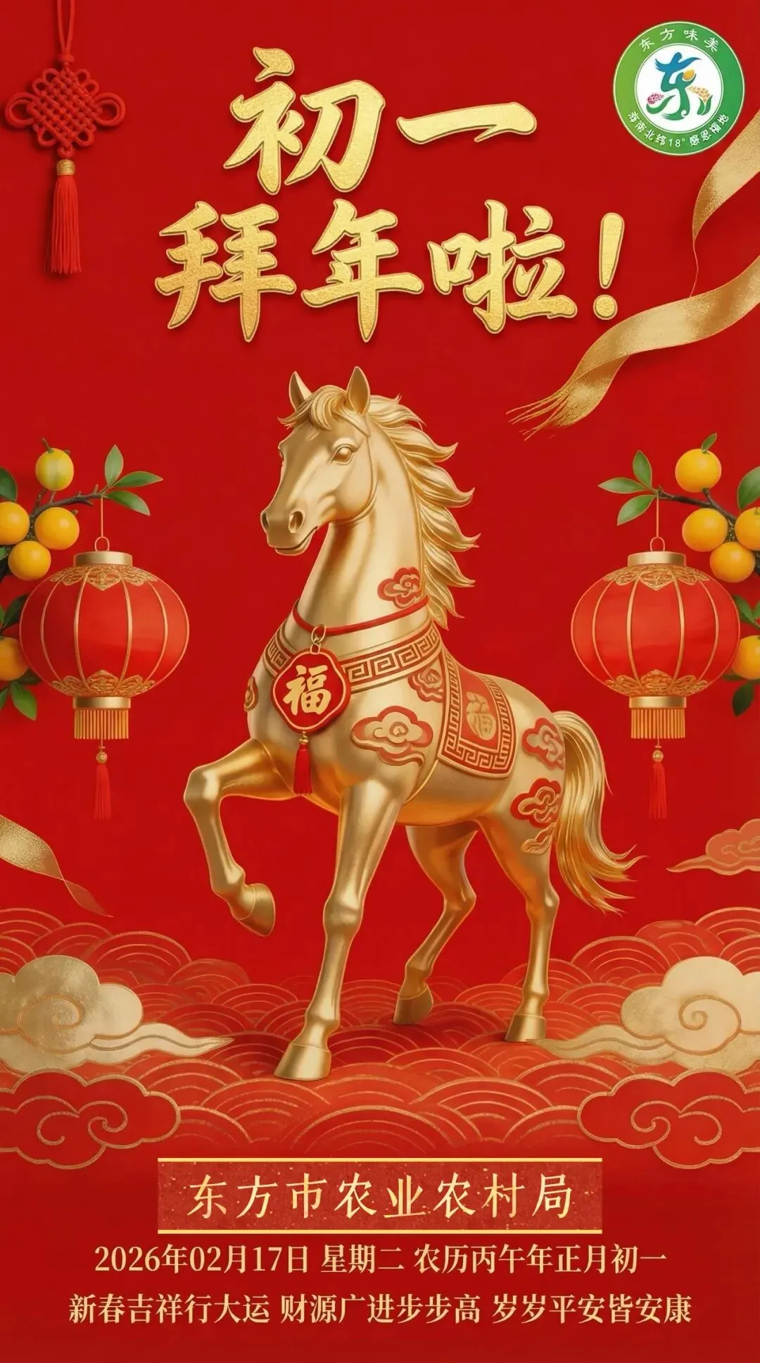 东方市农业农村局恭祝大家新年快乐,大年初一,一马当先,事事如意!