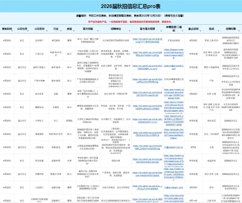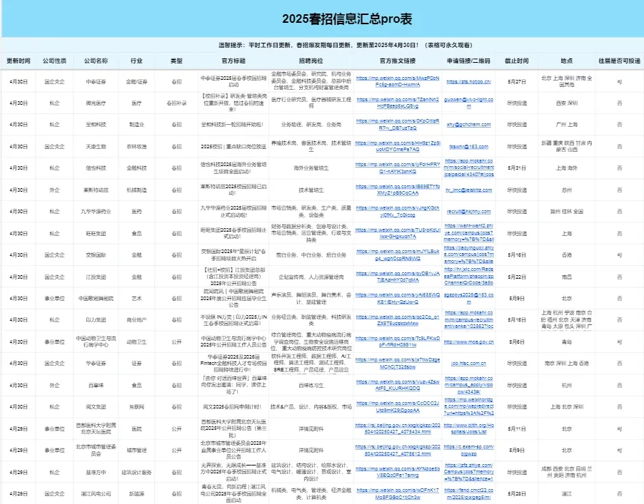 全力信息,来自企业工作人员和HR的委托,大量项目负责人/组内成员/继任招募者委托发布的招聘信息;实时整理更新,暑期/寒假实习信息汇总表、远程实习信息汇总表、春招/秋招校招信息汇总表、国企央企事业单位招聘信息等等涵盖金融、咨询、四大、互联网、快消、国企、事务所,房地产等等,地域涵盖 国内、英国、美国、澳洲、新加坡、加拿大、法国、德国、意大利等等地区行业:外资投行、券商、事务所、公募基金、银行、互联网、快消、咨询、地产公司、国企央企、公职类、事业单位考试资料等等购买会员可以获得至少50+新版央企笔试题库,200+地方2026年新版国企笔试面试资料;价值12500元+;200+新版四大OT、咨询OT、快消、投行 、外资投行 互联网、地产2026年模拟题库、真题库,价值超1万元;20+新版车企笔试题库,价值1000元;以及更新海外(英国、北美、澳洲、新加坡、欧洲)主流名企在线测评题公司:瑞银集团、汇丰银行、德意志银行、易方达基金、汇添富基金、博时基金、华夏基金、央行、国开行、进出口银行、农业发展银行、五大行、建设银行、浦发银行、招商证券、申万宏源、广发证券、方正证券、国泰君安、光大证券、MBB、国家电网、中国石油、腾讯、字节跳动、阿里巴巴、华为、四大、立信、碧桂园、保利地产、恒大、万达、戴德梁行等等其他:简历大礼包、北京/上海落户名单、各行业薪资表......实习资源,VIP会员专享,优秀实习会员,可以直接推荐给企业用人部门或者项目负责人,大大增加求职成功率。校招内推码,经常有企业工作人员提供本公司网申内推码给我们,都会第一时间分享给会VIP会员的小伙伴1.每天:我们对接了大量的企业HR/高管/项目负责人/项目组成员/继任招募者,委托我们发布的实习/全职招聘信息都具有非常强的时效性!每日精选10条以上当日实习信息,会员专属!2.每周:我们会定期整理,寒暑假实习信息汇总表、远程实习信息汇总表、春招/秋招网申汇总表、国家部委招聘信息等等,每周第一时间分享到VIP会员群!部分展示如下👇3.每月:整理更新求职资料,包括简历模板,行业知识、笔试真题、模拟题、面试资料、求职指南、技能自学攻略等等,都会第一时间分享给VIP会员。单单网盘题库、资料价值就已经超过3w,还有一些列附加服务,一年的陪伴式求职服务,社群答疑服务,每周优质岗位推荐服务,帮你打破求职信息差,让你少走弯路,帮你节省大量搜索信息和资料的时间,整个「VIP求职会员」定价是多少钱呢?只要399元/年。也就是说,您只要每天花1块钱左右,就能够得到到全年超5,000+条实习信息,3000+校招信息闹钟式提醒、30000G+求职资料持续更新;专属求职小助手1v1服务……我们「超级VIP求职会员」的服务本质,就是「让年轻人求职更简单」。我们将沿着这个目标持续改善和迭代我们的产品,未来高价值的服务内容也会不断增厚。
