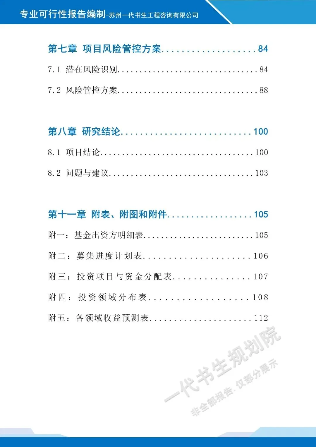 - 三是财务与风险管控要点。科学测算基金投融资成本、预期收益,明确资金筹措方案,测算核心财务指标,论证财务合理性;识别政策、市场、技术等潜在风险,制定针对性防控措施,建立风险分担机制,确保基金投资安全,为基金设立提供可靠的财务与风险支撑。