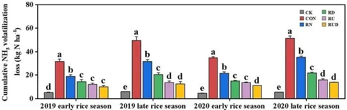 注: CK(不施氮肥);CON(常规施氮肥);RN(氮肥用量减少30%);RD(氮肥用量减少30%+氮肥深施);RU(氮肥用量减少30%+脲酶抑制剂);RUD(氮肥用量减少30%+氮肥深施深埋+脲酶抑制剂)