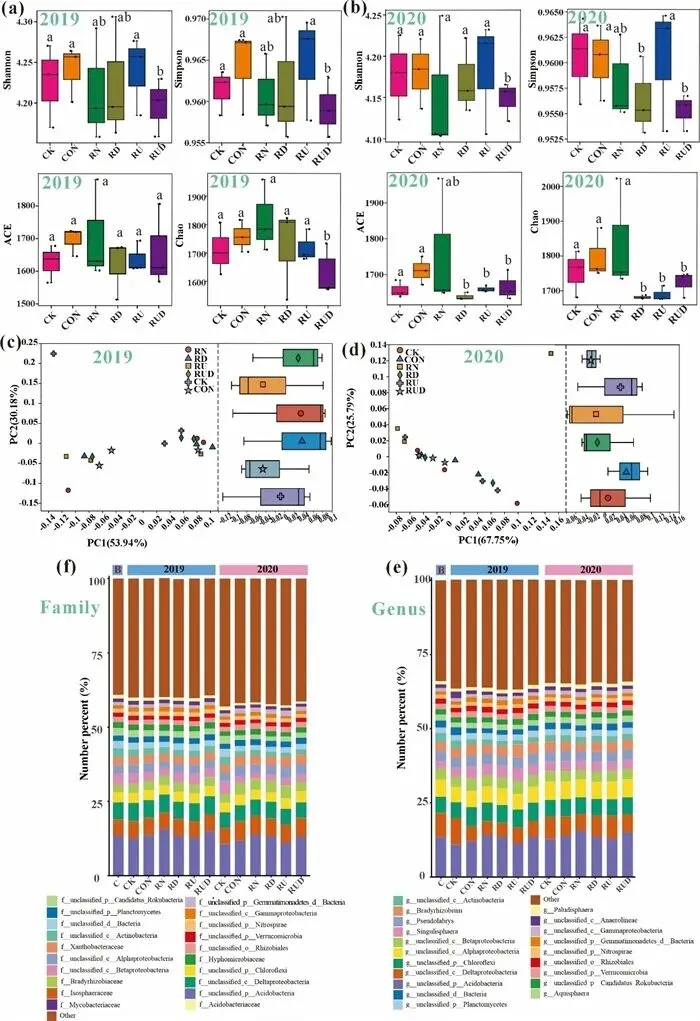 (a)和(b):六种处理方式下的土壤微生物α多样性指标(Shannon, Simpson, Chao1, ACE指数);(c)和(d):微生物群落组成的主坐标分析(PCoA);(e)和(f):不同处理方式下优势微生物分类群(属水平和科水平)的相对丰度。