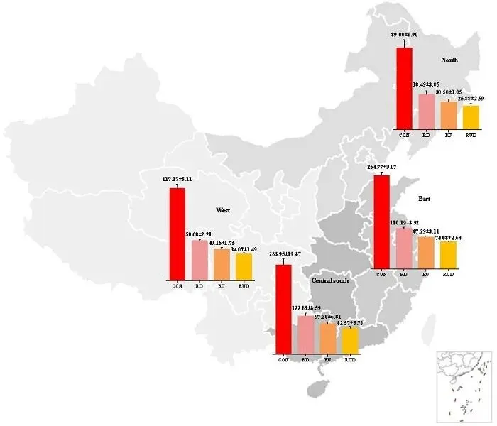 图3 中国各区域氨排放及各减排措施的减排潜力估算
