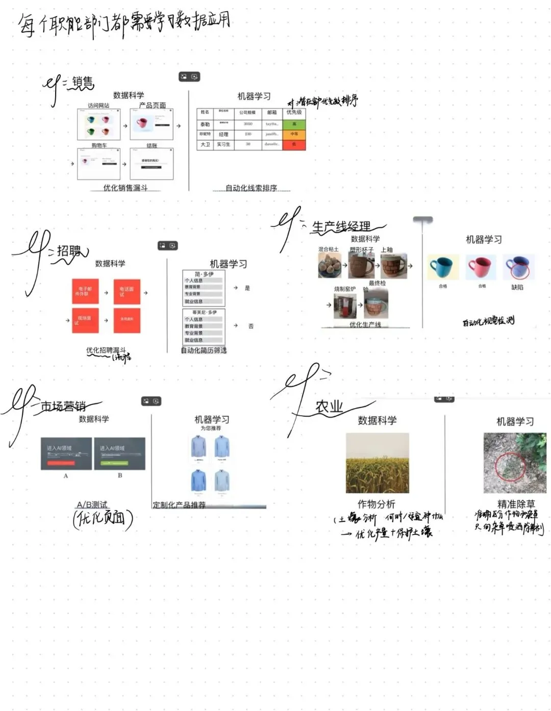 这次讲课的Andrew教授没有继续讲概念,而是挨个拆解了不同岗位正在被AI改变的方式——销售、招聘、市场营销、制造业、农业……