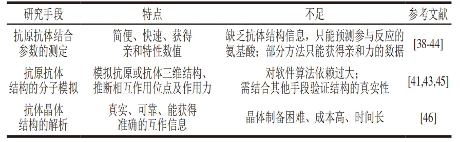 关于免疫分析法用于食品污染物的检测已有许多研究,但常常面临着抗体灵敏度低、特异性差、无法达到检测要求的难题,因此不少研究者开始探究抗原抗体的相互作用方式和识别机制,希望通过设计抗原或者直接改造抗体结构等手段获得高质量的抗体,进而提升方法的检测特性。针对重金属抗原抗体识别机制的研究手段主要有3 种,如表1所示,大多数研究将几种手段相结合,以探究重金属抗体对抗原的特异性识别及相互作用机制。