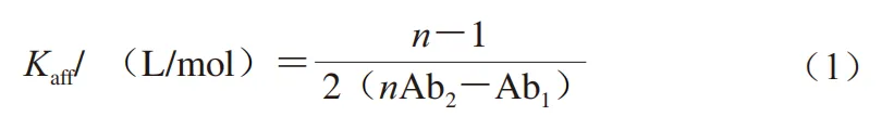 ELISA是一种根据抗原抗体特异性结合和酶-底物相互作用的原理检测抗体特异性的方法,可以分为直接法、间接法、夹心法。ELISA所测得的数据能结合质量作用定律转化为总抗体浓度的形式,推导出式(1),进而计算抗体亲和力常数Kaff。一般认为,抗体的Kaff值在107~1012L/mol之间为高亲和力抗体。